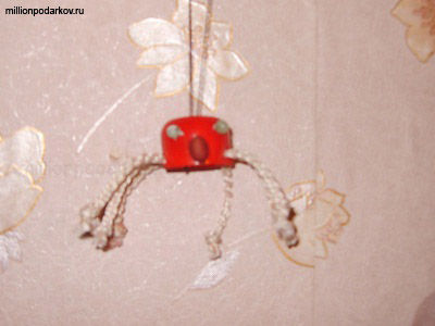 Наступил заключительный этап изготовления поделки из киндеров. Нам нужно приклеить глазки, носик и сделать подвеску. Для глаз используем маленькие бусины, для носа бусину побольше, приклеиваем их клеем. В середине верхушки киндера проделываем дырки и пропускаем через них ниточку, которая и станет подвеской. Поделка готова, можете ею украсить цветок или дать поиграть ребенку.