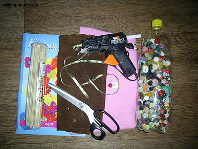 Для того чтобы сделать цветочки, нам понадобятся такие материалы, как флис, фетр, замша, пуговицы, бусинки, нитки, иголка, бамбуковые палочки, атласная лента.