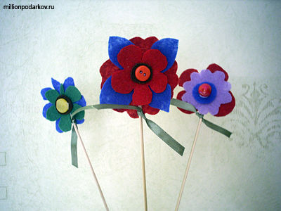 Теперь детали из ткани склеиваем вместе, приклеиваем термопистолетом бусинки или пуговички, крепим получившиеся цветы на бамбуковый шампур. Завязываем атласные ленточки – получаются листочки. Вот такой замечательный букетик у нас получился в итоге.