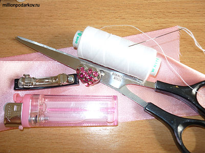 Для поделки из лент для девочек вам потребуется атласная лента шириной 5 см, нитки, иголка, сломанная брошка, заколка автомат, ножницы, зажигалка.