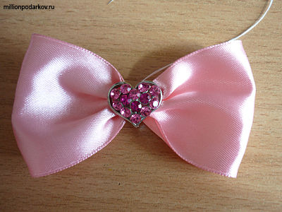 Отрезаем 20 см от ленты, обжигаем края. Прошиваем по-середине, так чтобы получился бантик.