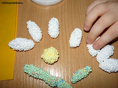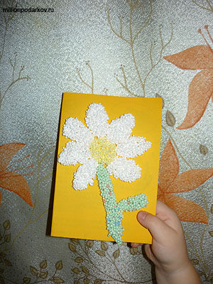 Приклеиваем части цветка к листку бумаги, немного их приминаем. Изготовление поделки из мелкозернистого пластилина "Ромашка" законченно!
