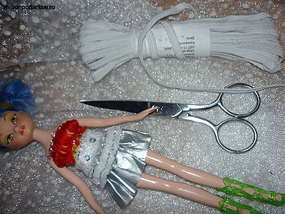 Для поделки потребуются остатки ткани, у которой не обсыпаются края, бельевая резинка, ножницы и кукла для которой мы будем делать юбку.