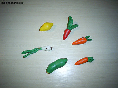 Лепим миниатюрные овощи и фрукты. В качестве прототипа можно воспользоваться любой картинкой или фотографией. У нас получился лимончик, три морковки, лучок и огурчик.