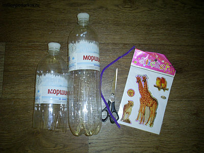 Для того чтобы сделать песочный набор, состоящий из ведерка, совочка и пасочки, нам понадобится 2 пластиковые бутылки, ножницы, наклейки и проволока.