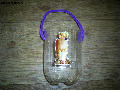 Для того чтобы сделать ведерко, отрезаем горлышко бутылки, аккуратно равняем края, чтобы не было зазубрин. Делаем отверстия и крепим проволоку – получается ручка. Украшаем получившееся ведерко наклейками.