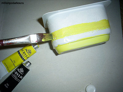 Рисуем на пластиковой упаковке полоски акриловыми красками.
