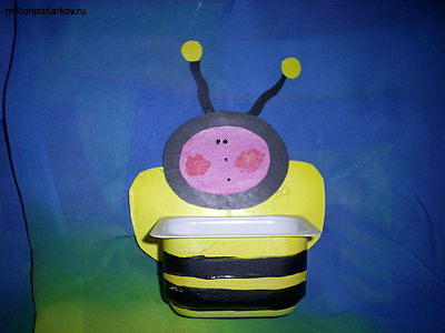 Изготовление поделки из пластиковых упаковок может стать прекрасным способом избавления от мусора, который обычно не нужен, но который бывает так жалко просто выбросить. Так, из пластиковой упаковки от детского йогурта можно сделать вот такую пчелку.