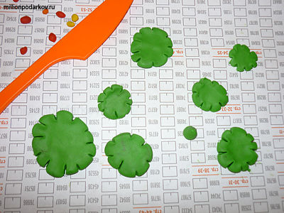 Сплющите зеленые шарики, затем сделайте стеком по краям небольшие надрезы.