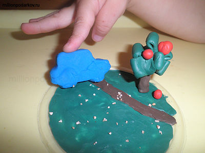 Теперь сыпим немного крупы на зеленую травку, можно выложить тропинку горохом. Из синего пластилина лепим машинку и наша поделка готова.