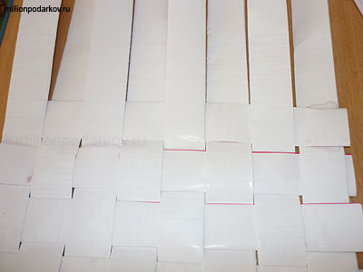 Плетем из бумажных полос коврик, просовывая одну под другую. Склеивая их между собой.