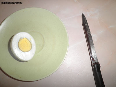Чисим яйцо от скорлупы и срезаем нижнюю часть так, чтобы оно устойчиво лежало на тарелочке.