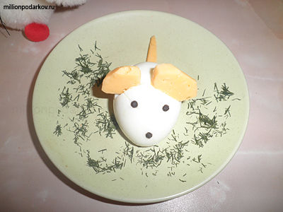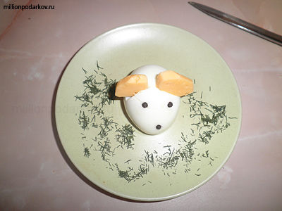 Из горошен перца делаем глазки, а из сыра вырезаем ушки, которые закрепляем в прорези на яйце.
