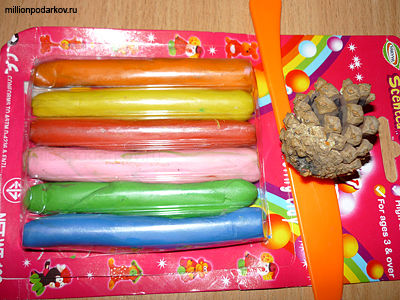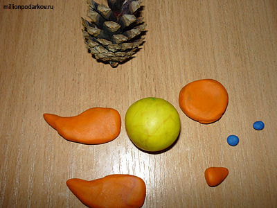 Для поделки из природных материалов "Птичка" вам потребуется сосновая шишка, пластилин, стек и подстилка для лепки.