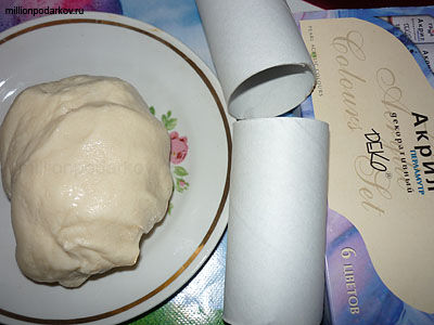 Приготовим то, что необходимо. А именно замесим соленое тесто. Делать это очень просто. Берём стакан муки, стакан соли и добавляем немного воды, всё перемешиваем и в холодильник на 2 часа. Вынимаем из холодильника и тесто готово. Еще нам понадобится 2 или 3 рулончика от туалетной бумаги. Так же не забудьте про краски, кисть и стаканчик с водичкой.