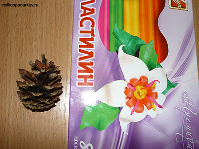 Для поделки из шишек и пластилина, кроме перечисленных материалов приготовьте еще, стек и какую нибудь старенькую газетку, которую потом не жалко выкинут. На этой газетке мы будем лепим нашу поделку.