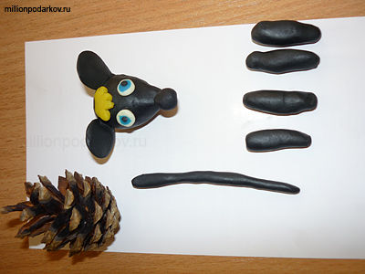 Лепим из пластилина лапы, мордочку и хвост. К мордочке добавим глазки, носик и ушки.