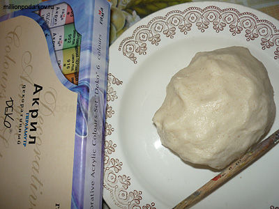 Для поделки из соленного теста "Гриб" вам потребуется готовое соленое тесто, краски акрил или гуашь, кисть, стакан с водой.