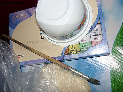 Для поделки из соленого теста Дед Мороз и Снегурочка приготовьте солёное тесто (мука, соль, вода), акриловые краски, баночку с водой, кисть, нитки, спичка.