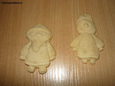 Лепим из теста фигурки Деда Мороза и Снегурочки. Делаем в верхней части фигурок отверстия с помощью спички.