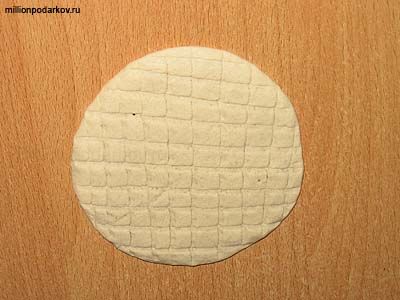 Соленое тесто раскатать в лепешку нужного размера и нанести тиснение в виде клетки. Основу - лепешку хорошо высушить.