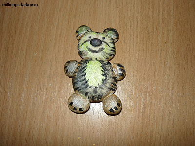 Лепим из теста фигурку мишки. Затем сушим её в духовке в течении часа с небольшим. Когда фигурка полностью засохнет, вынимаем её и остужаем.