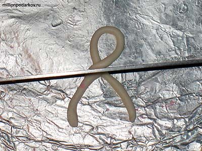 Сделать петельки одинаковой длинны не всегда получается. Поэтому предлагаю такой способ лепки петель: раскатанную тонкую колбаску сворачиваем в петлю нужного размера, а лишнее отсекаем.