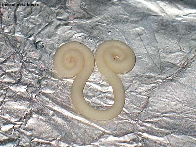 Тонко раскатанную колбаску нужной длинны сворачиваем в спиральку с двух сторон, а затем подтягиваем спиральки друг к другу, образуя под ними петлю.