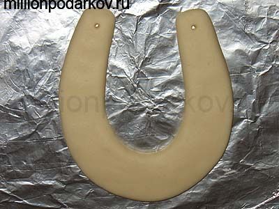 Из белого теста раскатать колбаску свернуть ее в форме подковы и придавливая пальцами растянуть ее по ширине.