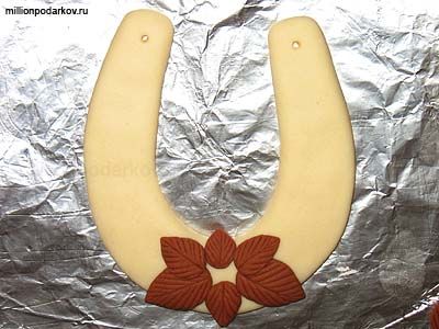 Из коричневого теста лепим листочки нужного размера и толщины, наносим стеком рисунок и выкладываем на подкове.