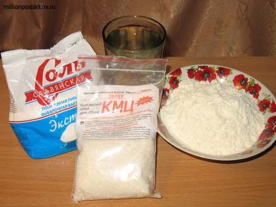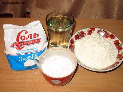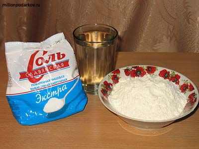 Классический рецепт соленого теста состоит из: муки 300 г (2 чашки), соль 300г (1 чашка), вода 200 г (200 мл). Мука лучше всего подойдет белая пшеничная, муку перед употреблением просеять. Соль использовать только самую мелкую - "Экстра". Для приготовления соленого теста необходимо брать чистую воду, если вода будет ледяной, тесто будет более эластичным.