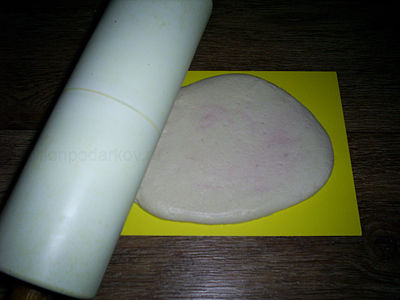 Берем кусочек теста и, положим его на лист картона, раскатываем скалкой до толщины 2-3 см.