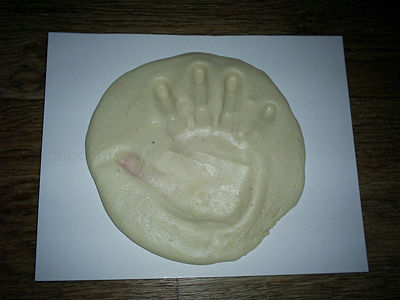 Теперь просим малыша приложить свою ручку к тестяному пласту и придавить. В итоге мы получим отпечаток.