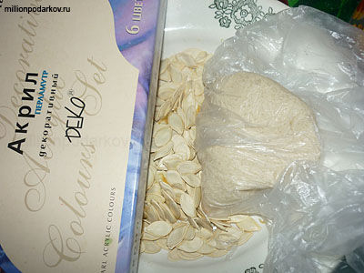 Для такой поделки из солёного теста нам потребуется готовое соленое тесто, кабачковые семечки, акриловые краски, кисть и стакан с водой.