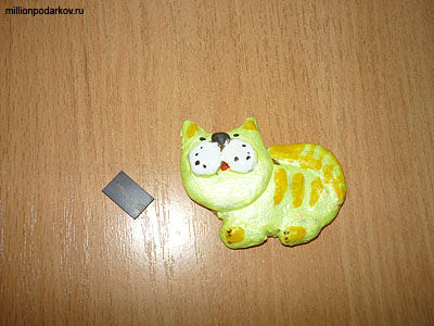 Приклеиваем магнит на холодильник. Изготовление поделки из солёного теста "Желтый кот на холодильник" законченно.