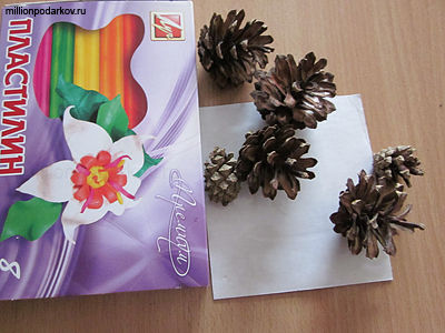Для этой поделки из сосновых шишек "Чебурашка" вам потребуются 6 сосновых шишек (4 среднего размера и 2 маленькие), так же вам потребуется пластилин и картон.