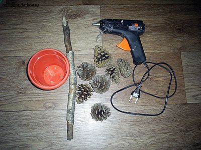 Для поделки вам понадобится много сосновых шишек приблизительно одного размера. Также подберите толстую прочную палку и горшочек для вашего будущего дерева. Склеивать шишки между собой лучше всего горячим клеящим пистолетом.