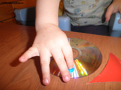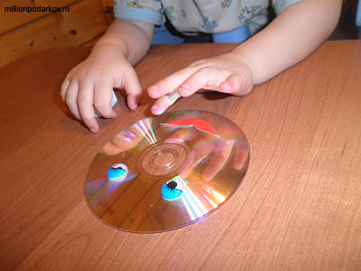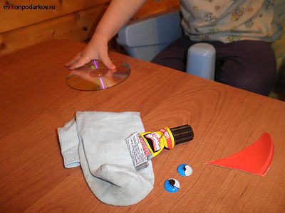 Для поделки из старых дисков нам нужен будет кроме самого диска носок, клей «Момент» и глазки от старой книжки. Для рта нам нужен будет красный картон и ножницы