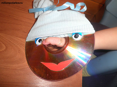 Надеваем носок и завязываем красивой ленточкой. Забавная рожица уже готова, поделки из старых дисков всегда очень оригинальны.