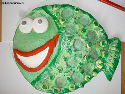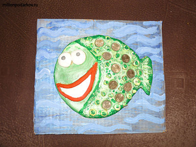 Берем картон необходимого размера и рисуем на нём море. Затем когда рисунок высохнет, приклейте рыбу к картону.После этого приклеиваем монеты.Изготовление поделки из теста для дома "Денежная рыба" законченно.