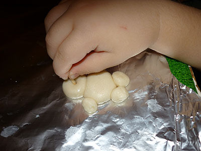 После того, как тесто готово приступаем к лепке снеговика. Для этого попросите ребёнка скатать 2 больших шарика и 4 шарика поменьше.