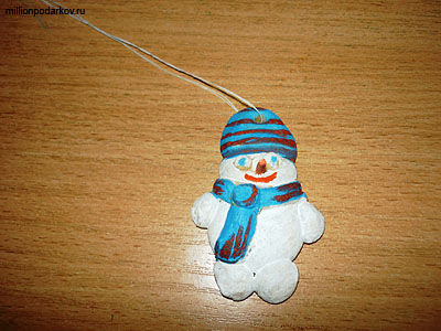 Вдеваем нитку в отверстие. Снеговик на ёлку готов!