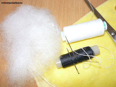 Для поделки из ткани вам потребуется велюр желтого цвета, синтепон, черные нитки с иголкой, ножницы, декоративные материалы (бусина и цветочек).