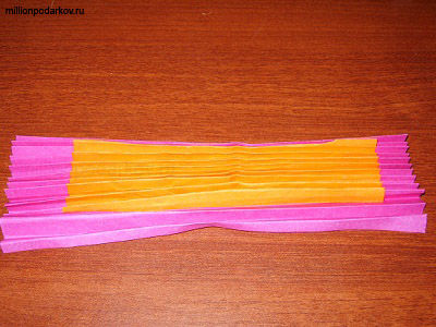 Для крылышек нам понадобятся два прямоугольника из цветной бумаги. Один из них большего размера. Меньший прямоугольник приклеиваем посередине большего, затем складываем гармошкой.