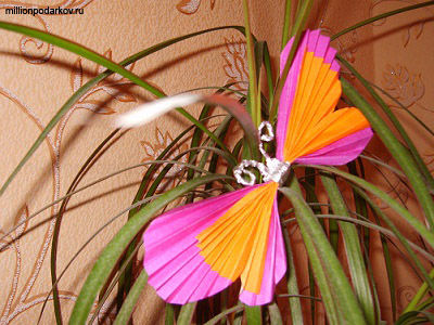 Посередине гармошку обвязываем нитками, затем разрезаем гармошку в соотношении 2:1, 2/3 гармошки будут большие крылышки, 1/3 гармошки станет маленькими крылышками. Придаем форму крылышкам. Обматываем середину гармошки фольгой и делаем усики. Вот и готова поделка из цветной бумаги детей 7-8 лет, фото вы видите, осталось попробовать сделать такую поделку со своими детьми.