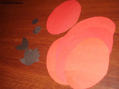 Из картона вырезаем основы поделки из цветной бумаги для детей "Божья коровка". По этим основам из красной бумаги вырезаем овалы, а из черной - заготовки для головы.