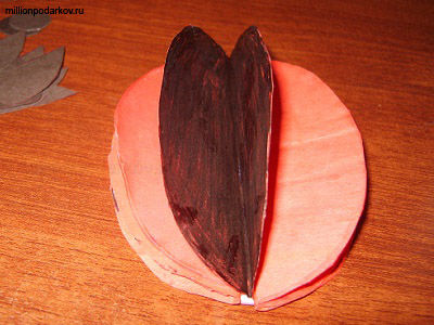 Приклеиваем на картон согнутый пополам красный овал, к нему приклеиваем еще один. И так далее. Последний овал, согнутый пополам, приклеиваем к предыдущему овалу и к картону. Получается туловище бабочки. Овал, который в середине, раскрашиваем черным фломастером.