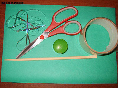 Для поделки из цветной бумаги к Новому году нам потребуется палочка для ствола, цветная бумага для еловых лап. Также для изготовления поделки нам понадобятся колпачок, ножницы, клей, украшения.