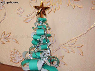 Для того, чтобы поделка из цветной бумаги к Новому году приобрела завершенный вид, ее нужно украсить. Для этого наверх прикрепляем звезду, саму елку можно украсить гирляндой, мишурой или дождиком. Поделка готова. Теперь даже рабочий стол сможет поднять вам настроение до предновогоднего.