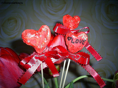 Когда шпатлевка высохнет, раскрасим сердечки акриловыми красками. С помощью клеящего термопистолета приклеим к сердечкам шампура. Сделаем атласные бантики и приклеим их к палочкам под сердечками. Маркером можно написать на изделиях подходящие слова. Декорируйте сердечки клеем с глиттером. Вот такие поделки из туалетной бумаги у нас получились в итоге.